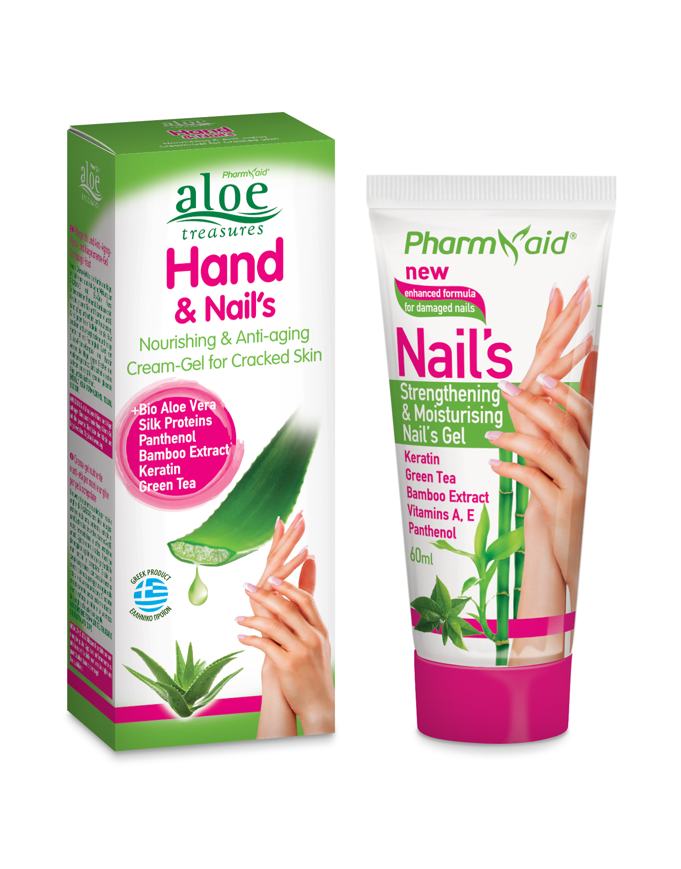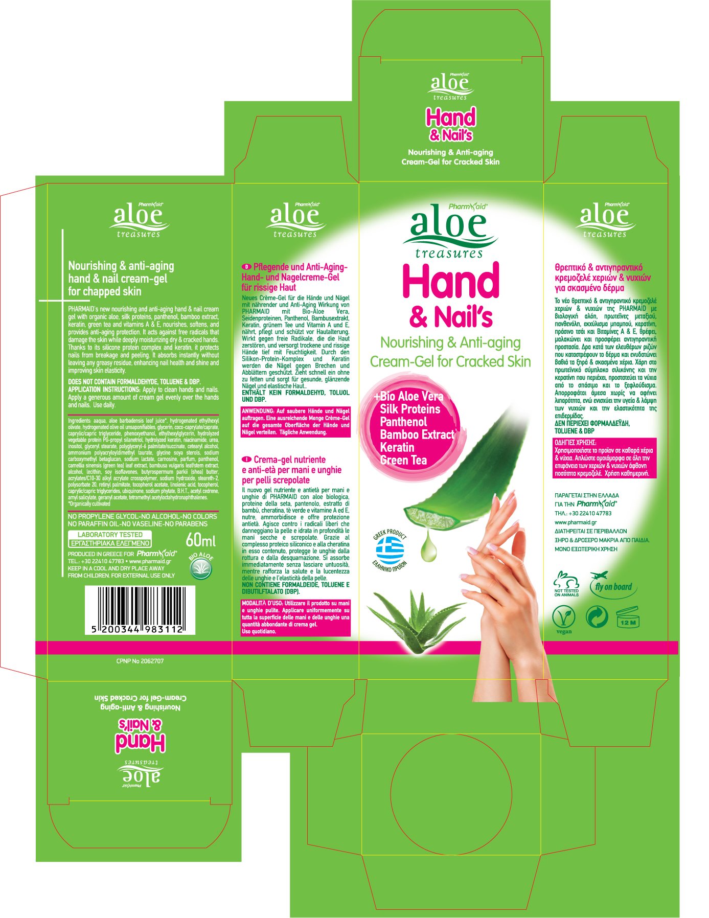 Nourishing and anti-aging hand & nail cream gel with organic aloe, silk proteins, panthenol, bamboo extract, keratin, green tea and vitamins A & E.